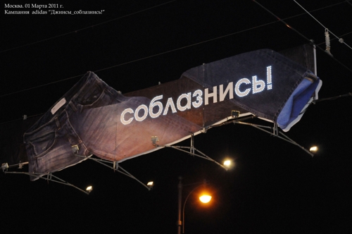 При поддержке агентств Magic Touch и Master Ad на носителях Московской Городской Рекламы было разработано и размещено девять креативных перетяжек. Конструкции устроены таким образом, что благодаря внешней подсветке, на фоне других ООН-макетов, стильный Denim от Adidas очень выделяется и легко бросается в глаза.